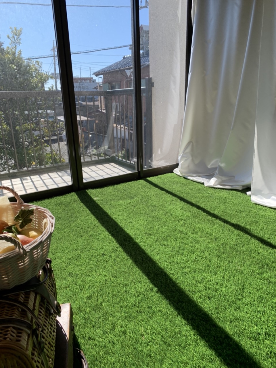 自然光がよく入る明るい部屋です。和室だった部屋に芝生とカーテンを設置しました。