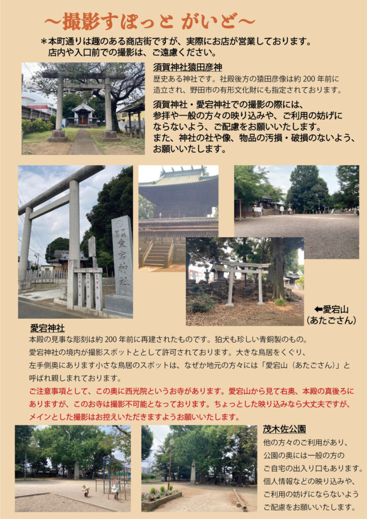 スタジオの外へ飛び出しましょう。神社や公園、町の通りで撮影ができます。